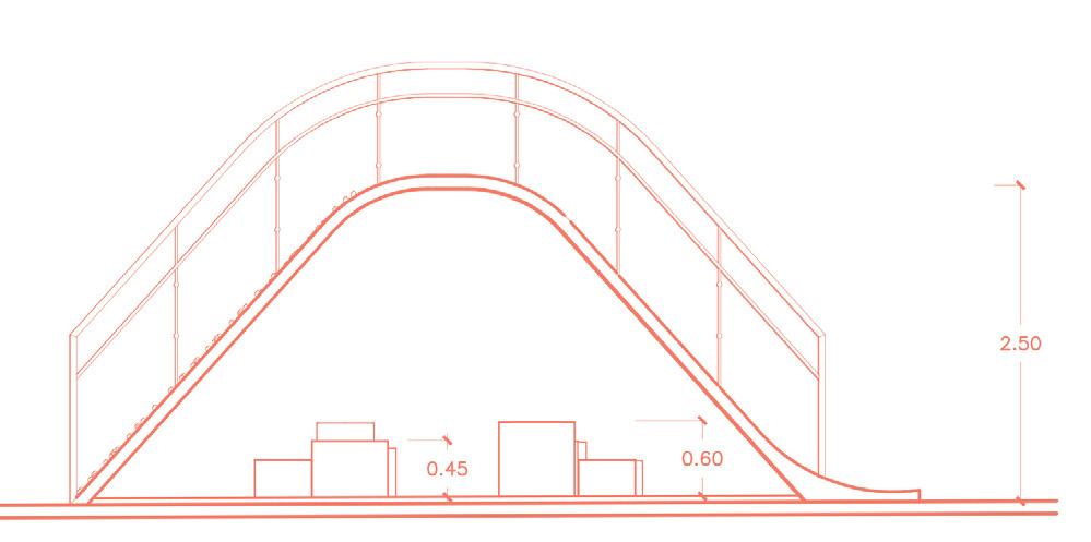 Reinforced concrete bridge with a yellow plastic coating, offering the ability to climb on one side and slide on the other, providing more dynamism than a conventional slide. Underneath the bridge, there are small platforms for children to play around or on them, also serving as benches and an area to rest.