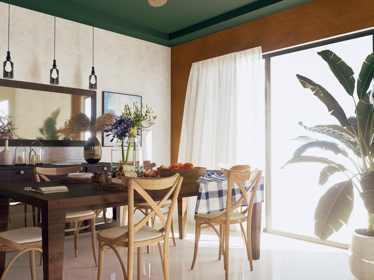 Integration of existing furniture: drawing inspiration from the current dining table and chairs, aiming for visual harmony between materials and hues.