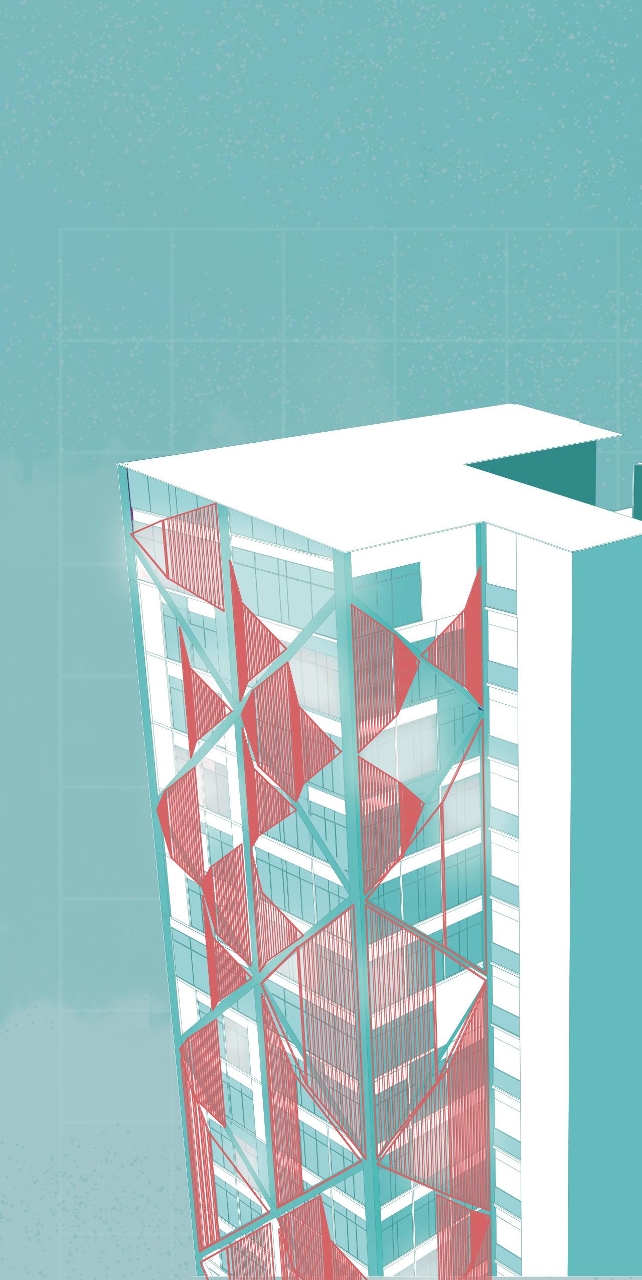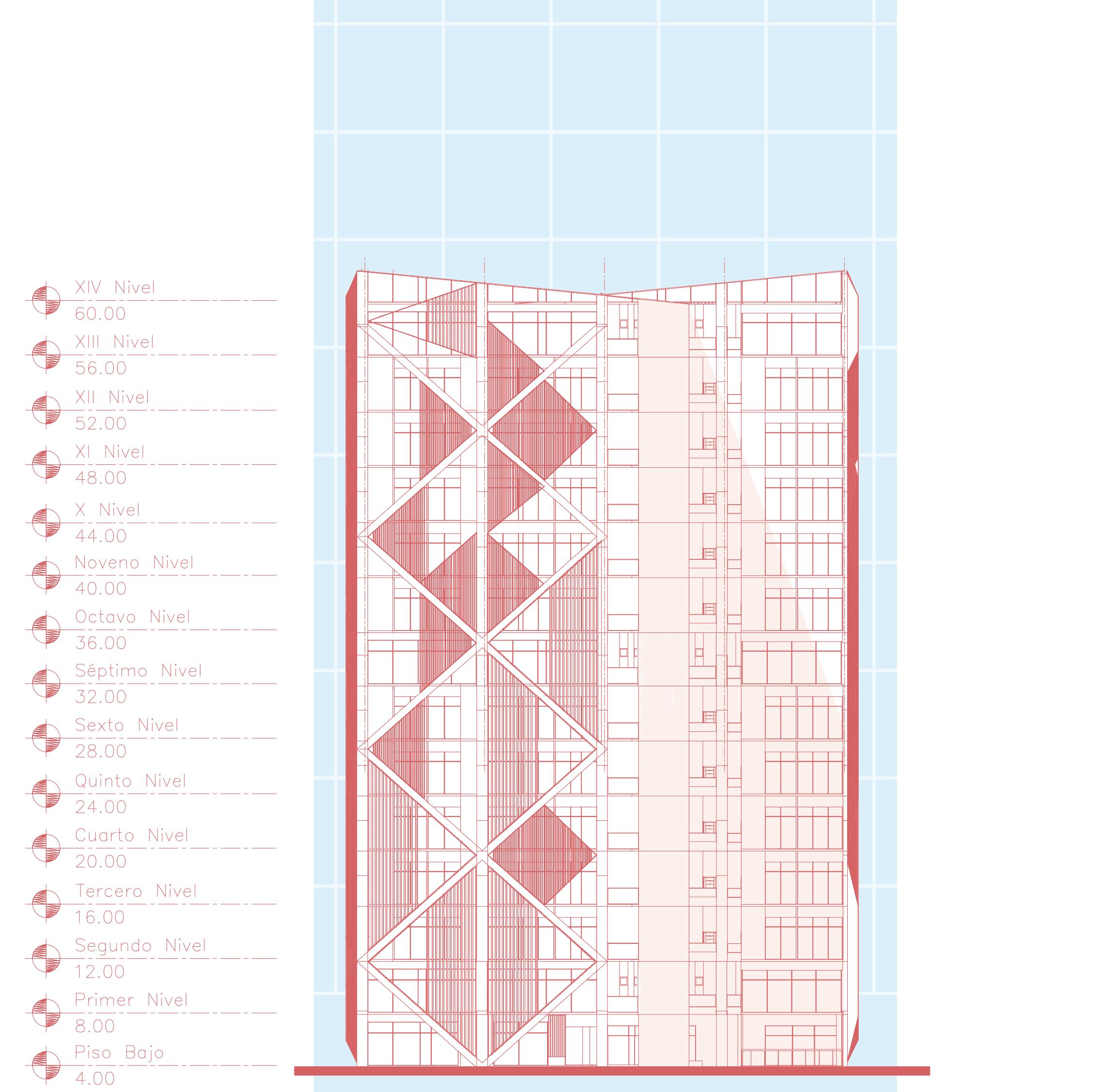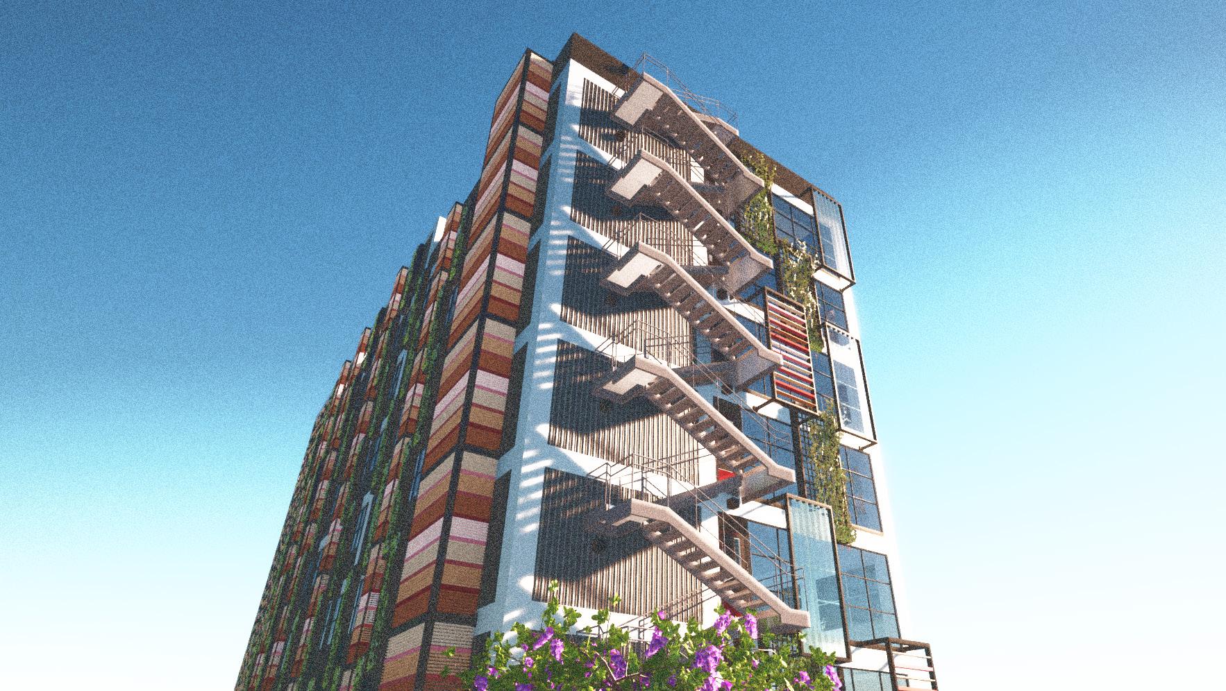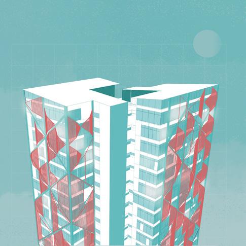 Together with my classmate, Josué Zelaya, we decided to direct the project towards sustainability, the incorporation of vegetation and life, and art. The building consists of two towers in an “L” shape, interconnected in the area of the elevators and emergency staircases. These spaces provided us with the opportunity to design open common areas, thus promoting an environment that breathes nature and fosters well-being.