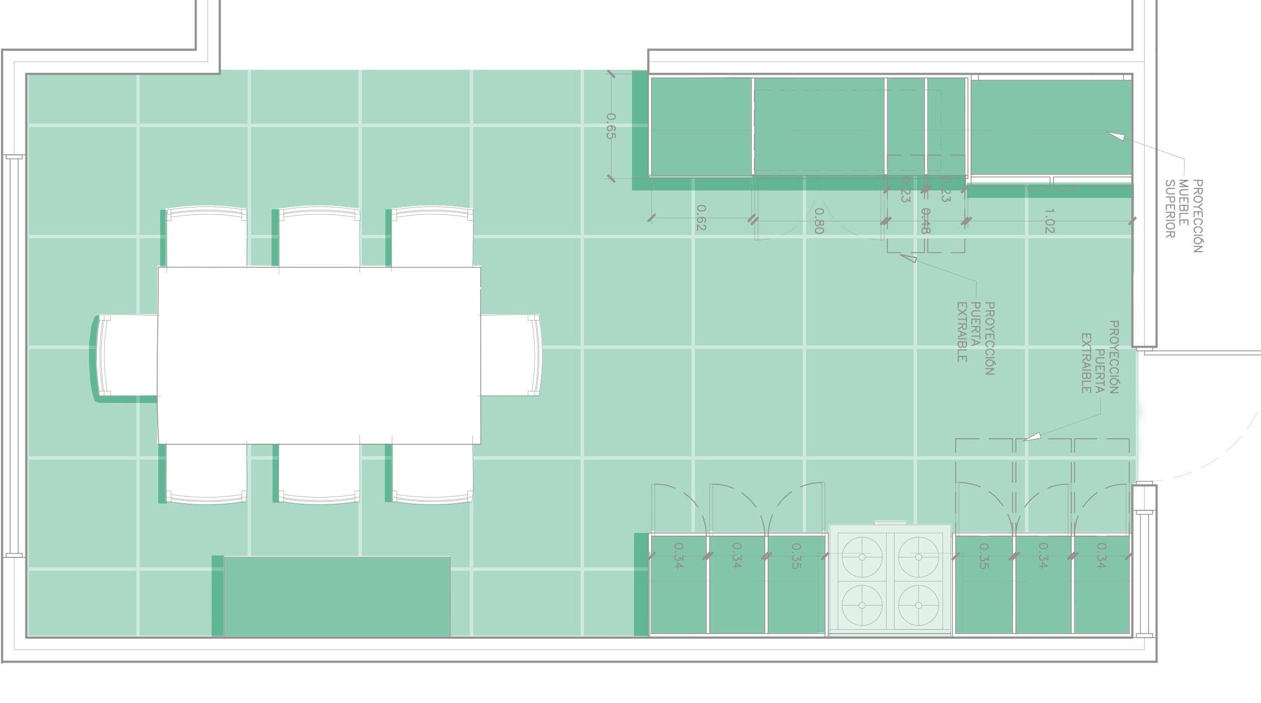 It was chosen to use a dark green color both on the walls and the ceiling to emphasize the warm and natural tones of the wood.