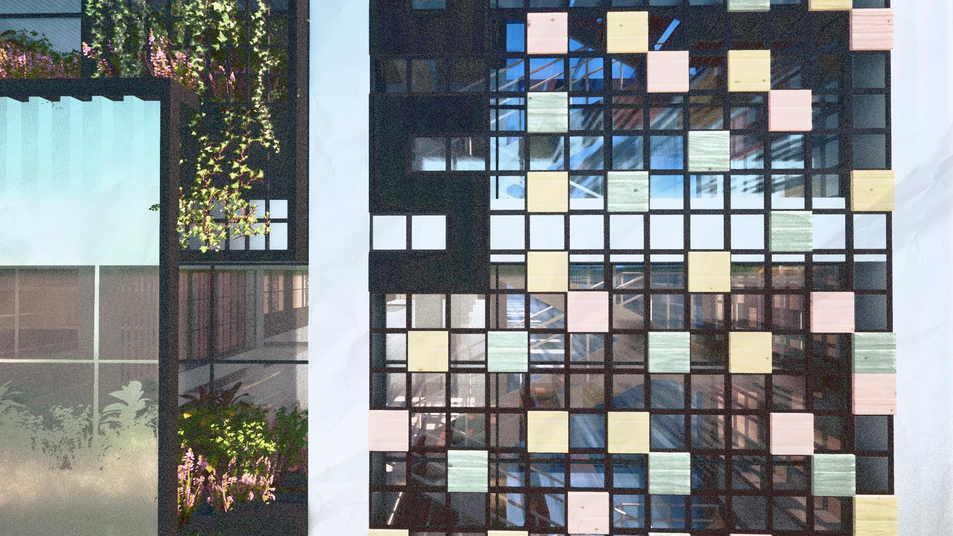 The design of the main facade was inspired by the aesthetics of pixels, which not only provides pleasant shade and allows airflow but also incorporates a carefully selected color palette. This contributes to both energy efficiency and the aesthetics of the building.