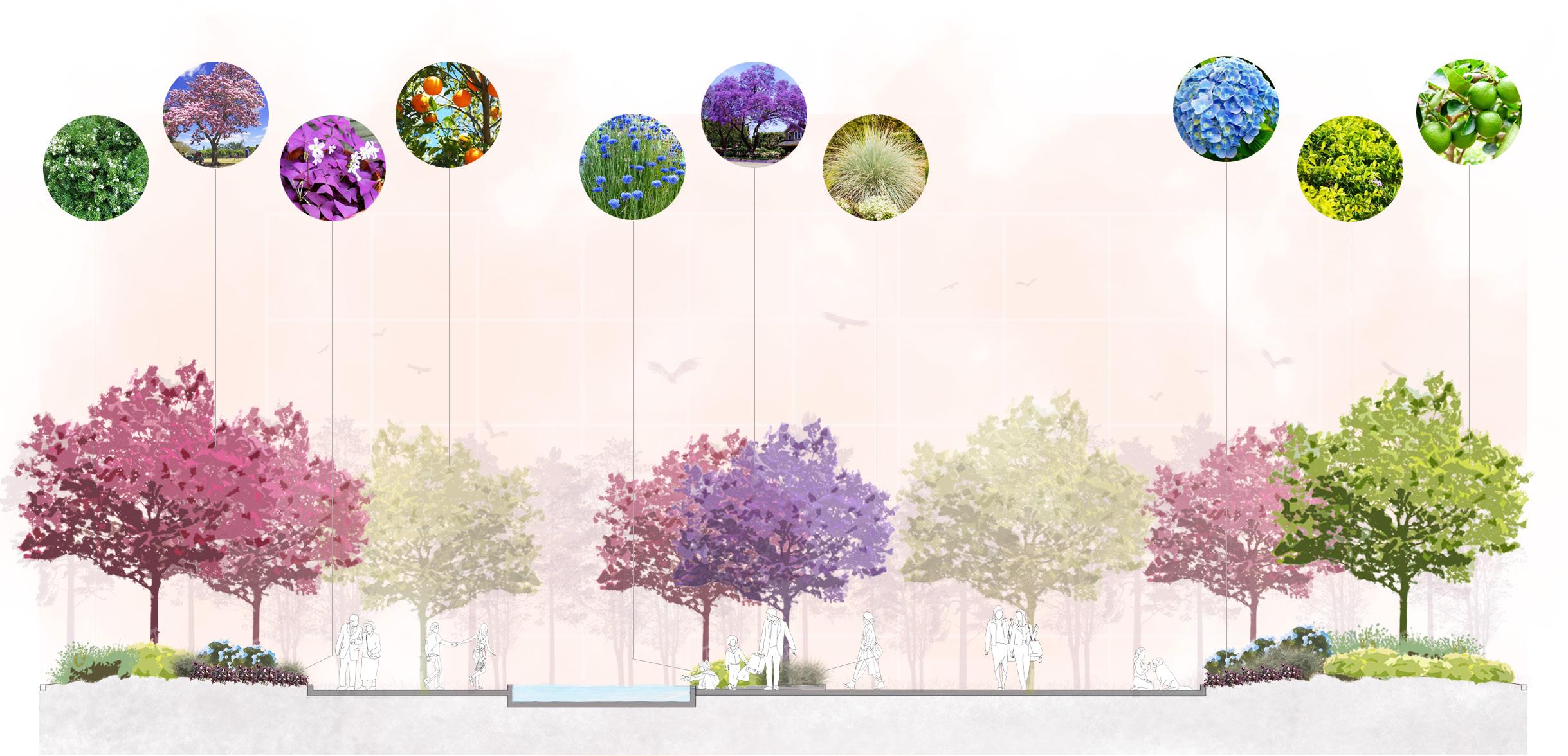 By incorporating native plants and trees, the plaza adapts more efficiently to the specific climatic and ecological conditions of the area, promoting landscape resilience, and contributing to the preservation and restoration of the ecosystem.