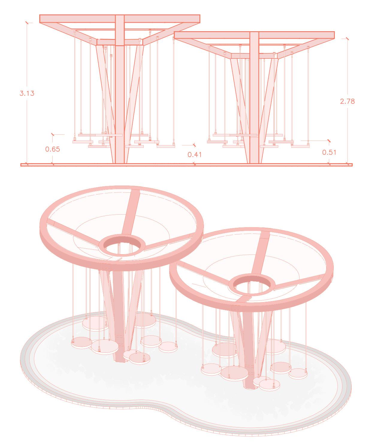 Inspired by the shape of trees, these metal structures are surrounded by small fixed platforms that serve as tables, benches, and also function as a play area.