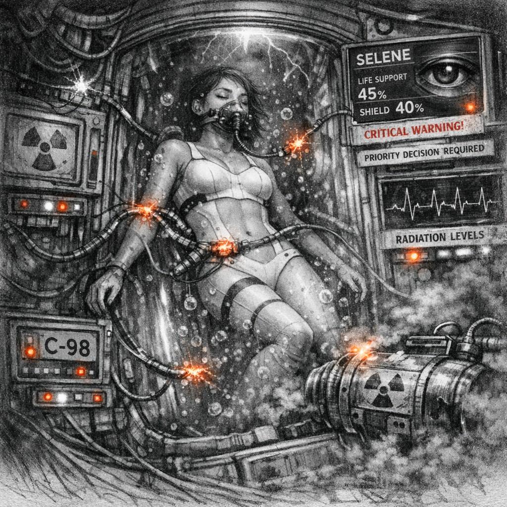 este dispositivo de protección en un estado crítico: con el 45% de sus sistemas habilitados para sostener la vida, el escudo al 40% de su capacidad de nanoescudos. Definitivamente no iba a resistir otro impacto. Las baterías nucleares de citrinio-98 estaban gravemente dañadas, pues de haber sido el corazón vital de la cápsula, se habían convertido en los verdugos silenciosos de "ELLA-33I0". Los contaminantes de la radiación se estaban filtrando a través de los sistemas que sostenían la vida de la tripulante.