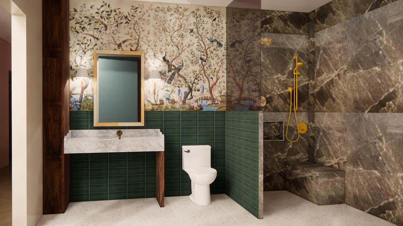 The Primary bedroom is designed to be a serene oasis for Margot and Julien to relax. The neutral color pallete is hilighted with colorful accents to mimic the natural elements of Charleston, while adding in elements of French design through the marble checkered flooring and limestone sinks. Additionally built-in elements were incorparated through the window seating in the bedroom and bathroom.