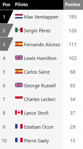 Con estos resultados, Verstappen estiró las ventajas en la punta de la tabla de posiciones del campeonato a 195 puntos. Su coequiper, Checo Pérez, lejos de su mejor versión, le sigue con 126; mientras que Alonso completa el trío de punta con 117 unidades, excelente año para Fernando Alonso.