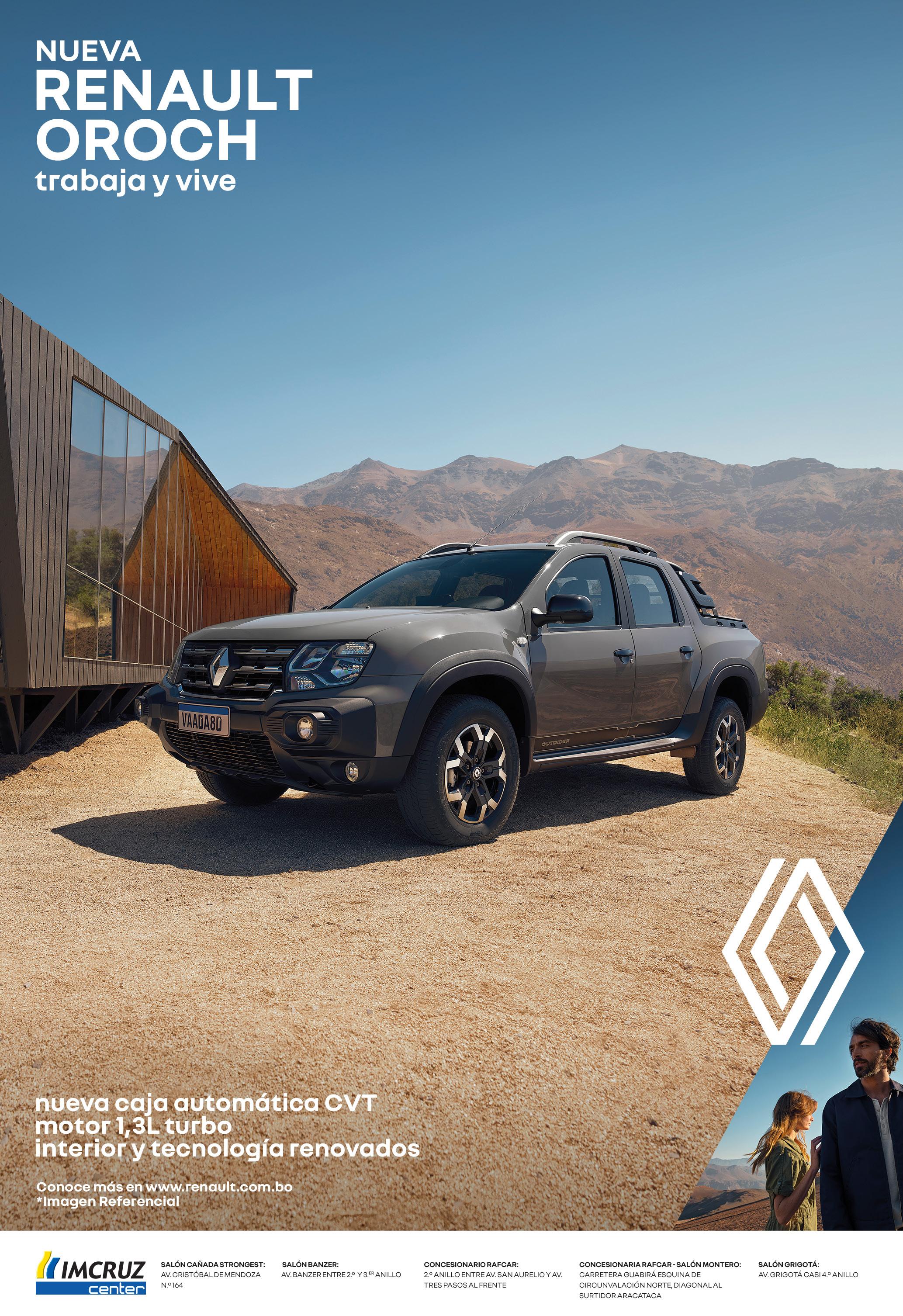 Lista para cualquier desafío con nuevo motor 1.3 tce (turbo control efficiency), nuevo diseño y mayor conectividad. La nueva Renault Oroch, viene con un innovador modelo que piensa revolucionar el segmento de las pick up con su increíble potencia y torque adicional, gracias a su nuevo motor 1.3 turbo, un nuevo diseño exterior que aumenta su robustez, un interior completamente renovado y más sofisticado, así como el equipamiento de nuevas tecnologías para mejorar la conectividad inalámbrica, el confort pero sobre todo la seguridad, incorporando un sistema anti vuelcos, cámara de retroceso y asistente de arranque en pendiente