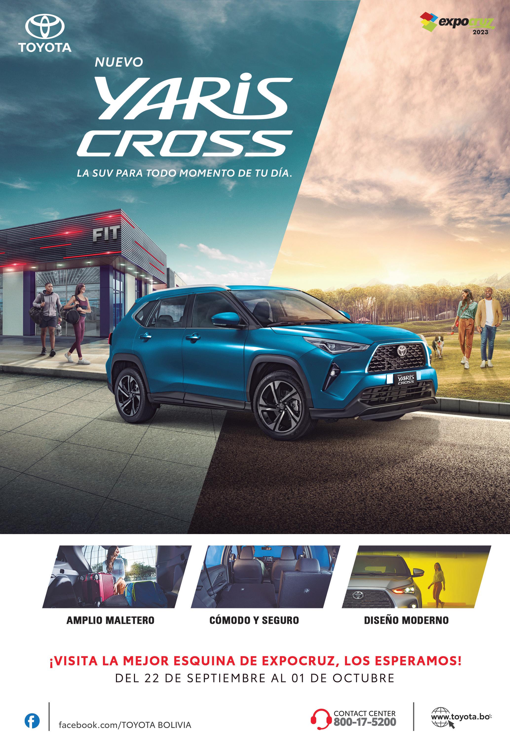 El nuevo YARIS CROSS, un SUV compacto que se encuentra basado en la nueva generación del icónico de la marca, YARIS sedán, es presentado para Bolivia de la mano de TOYOSA SA en sus cuatro versiones, MID MT, MID CVT, HIGH CVT E HIBRIDA. Este vehículo de calidad viene en una versión renovada y fue recientemente presentado en América Latina, cuenta con una pantalla touch de 10”, diseño interior moderno, espacio interior amplio, un motor de 1.5 lts, 104.6 HP, Aros de 17”, 6 airbags, frenos ABS con EBP, entre otras muchas atrayentes características; el mismo promete ser de los vehículos preferidos en nuestro país, gracias a sus características adaptables a diferentes tipos de territorio, circunstancias y necesidades.