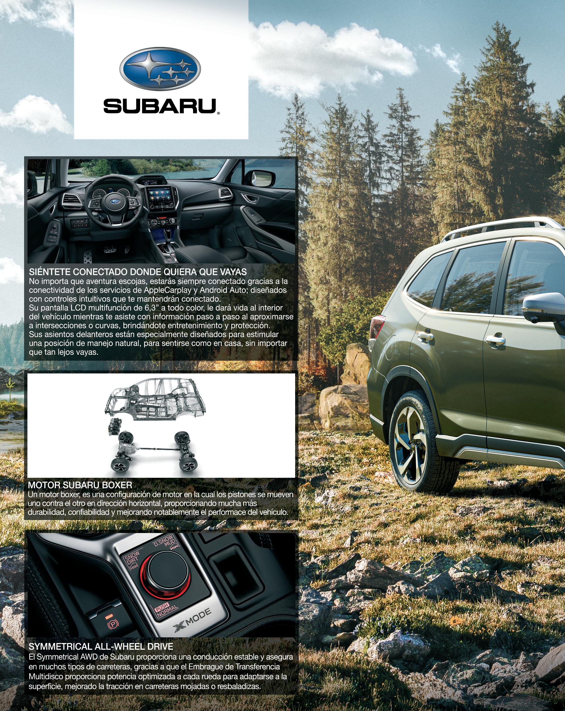 El Forester rediseñado te ofrece confort, seguridad, y versatilidad, para darte apoyo a través de todas tus aventuras diarias a la vez que te anima a emprender otras nuevas. Con un diseño de SUV más audaz y potente y la capacidad de respaldarlo, el Forester te brinda la tranquilidad que proviene de saber que todos lo están pasando de maravilla. Disfruta con seguridad las ventajas de la conectividad de tu smartphone mientras conduces, con servicios tales como Apple CarPlay y Android Auto. Diseñado para entregar avanzada funcionalidad y facilidad de uso, el Forester te brinda las más modernas funciones de info entretención y controles intuitivos. Combinado con asientos delanteros confortables que estimulan una posición de manejo natural, te sentirás como en casa, sin importar cuán lejos vayas.