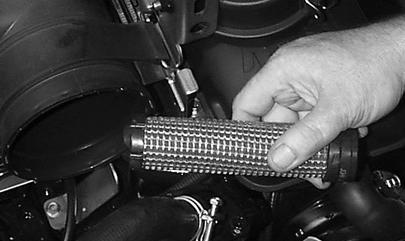 5. Turn secondary safety filter element (E) so closed rubber end (F) is inserted first into the air filter housing (opposite normal installation).