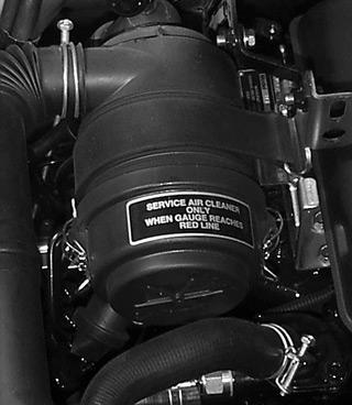 2. Open hood and locate air restriction indicator on air cleaner outlet hose at rear of engine compartment.