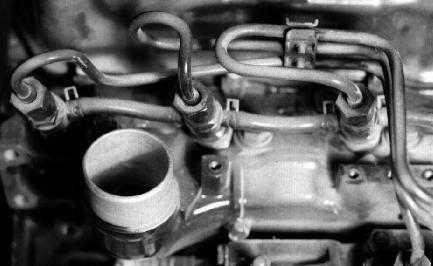 4. Using a 17 mm open end wrench or crows foot, loosen high pressure line nuts on top of fuel injector nozzles.