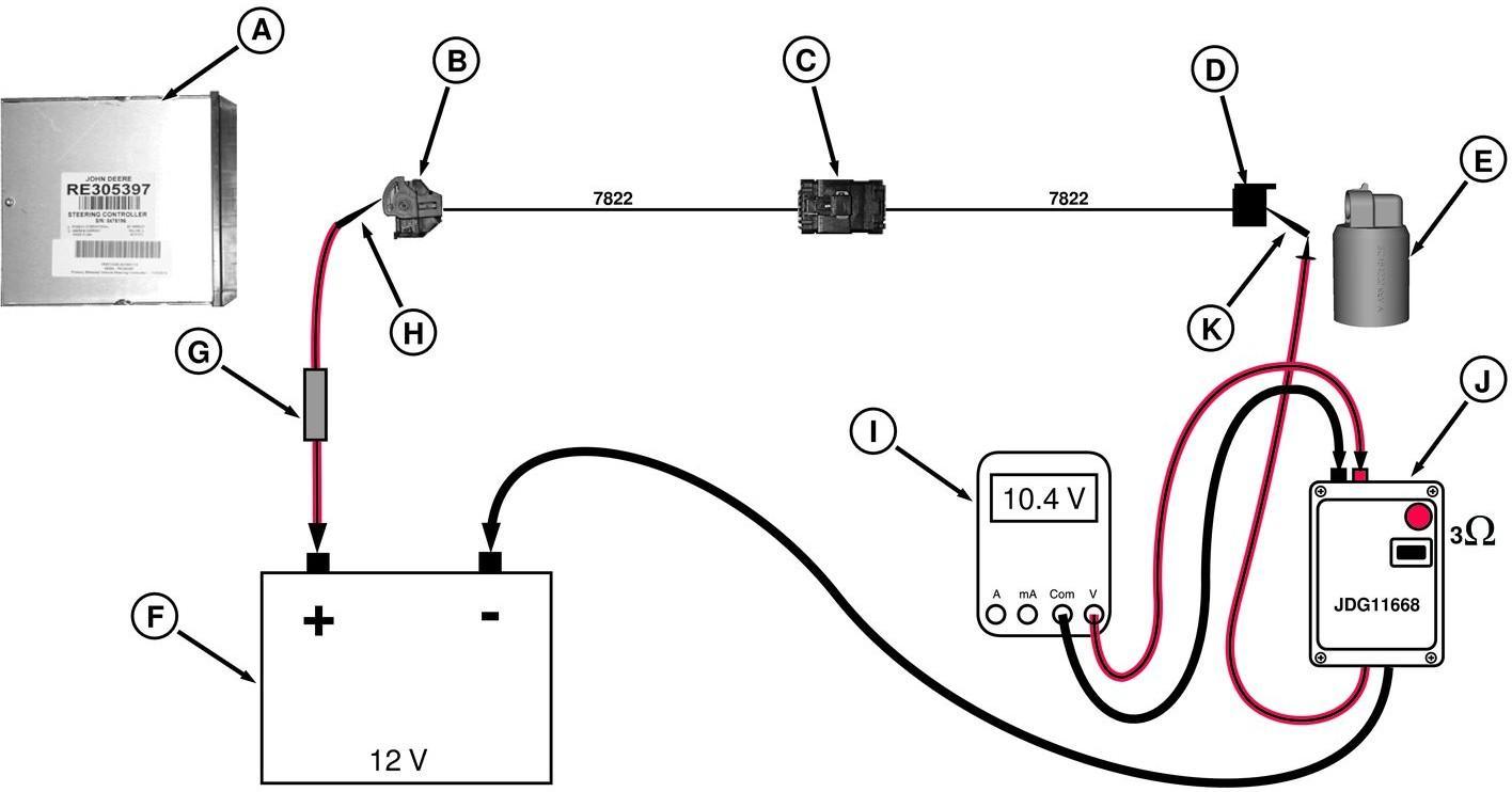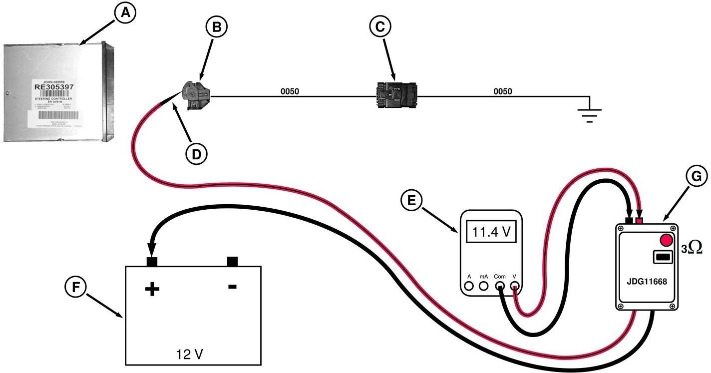 6. Press button on JDG11668 to apply load. Note and record voltage at multimeter (E) while the button is pressed.