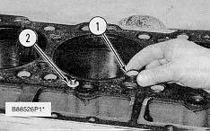 1. Thoroughly clean the spacer plate and the bottom surface of the cylinder head assembly. Install a new head gasket, new seals (1) and two O-ring seals (2).