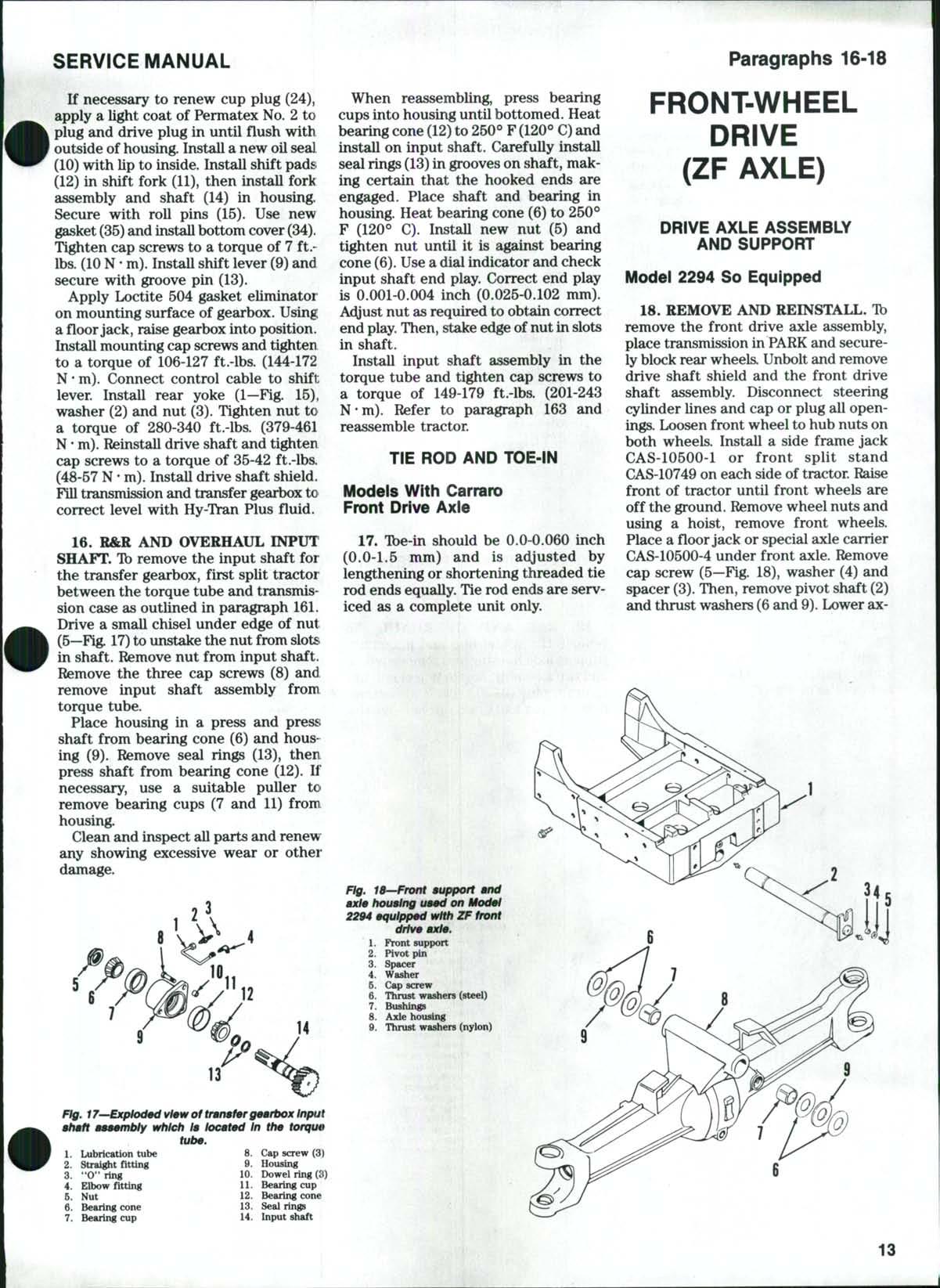 9. REMOVE ANDREINSTALL. Tb remove the front drive axle assembly, place transmission in PARKand securelyblock rear wheels Unbolt and remove drive shaft shield andthe front drive shaft assembly Disconnect steering cylinder lines and cap or plug all openings Loosen front wheel to hub nuts on both wheels. Install a side frame jack CAS-10500-1 or equivalent on each side of tractor. Raise front of tractor until wheels are off the ground Remove wheel nuts andusing a hoist, remove front wheels Place a floor jack or special axle carrier CAS-10500-4 under front axle Removebearing lock(3—Fig 8) and grease fittiiig (4) from bearing support caps(1 and 11),then unbolt and remove caps Lower axle (floorjack) or raise tractor (axle carrier) and roll assembly forward from tractor Remove bushings (8 and 15) with *'O**rings (7, 9, 14and 16), sleeves (6 and 13) and thrust washers (5and 12).