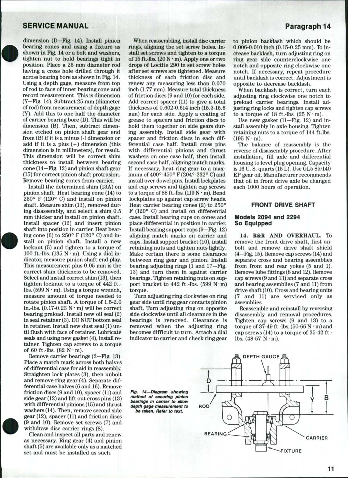 If removed, install sleeve bearings (8 and 15) Install new oil seals (9 and 14) with lipsof sealstoward sleeve bearings Install cup plugs (20) and bearing cups (19) in axle housing Lubricate lips of seals (9 and 14), then insert axle shaft into axle housing Make certain axle shaft splines engage splines in differential side gears. Install new "0" rings (16), sealcaps(17) and bearing cones(18) on pivot pins and lubricate bearing cones with lithium grease Carefully install pivot housing (5) over sun gear and axle housing. Install lower pivot pin assembly and tighten cap screws finger tight. Install upper pivot pin assembly with original shim (7) and cap screws tightened finger tight Tbrque the bottom cap screws first, then the upper cap screws to 140ft.-lbs (190 N• m) Check swing resistance with a torque wrench which should be 16-21 ft.-lbs (21-28 N* m) with new bearings or 8-10.5 ft.lbs. (10.5-14N • m)for used bearings.Adjust swing resistance by using alternate shim thickness Shims are available in thicknesses of 0.024, 0.039, 0.055, 0.063, 0.071 and 0.079 inch (0.6, 1.0, 1.4, 1.6, L8 and 2.0 mm).