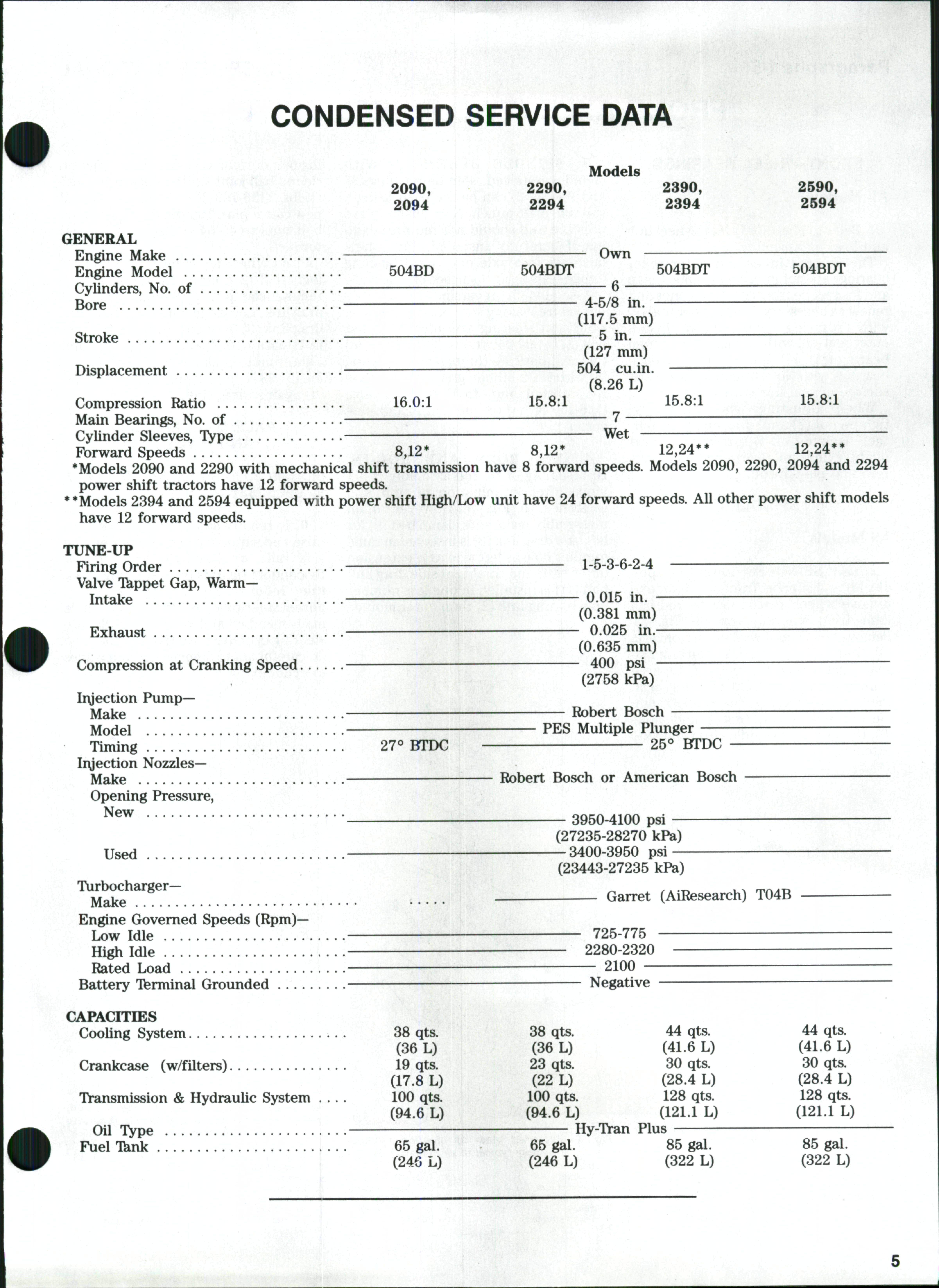Models 2090, 2094 2290, 2294 2390, 2394 2590, 2594 GENERAL Engine Make " Own Engine Model 504BD 504BDT 504BDT 504BDT Cylinders, No of — 6 Bore —•— 4-5/8 in. (117.5 mm) Stroke 5 in — (127 mm) Displacement 504 cu.in — (8.26 L) Compression Ratio 16.0:1 15.8:1 15.8:1 15.8:1 Main Bearings, No of 7 Cylinder Sleeves, TVpe Wet Fbrward Speeds 8,12* 8,12* 12,24** 12,24**