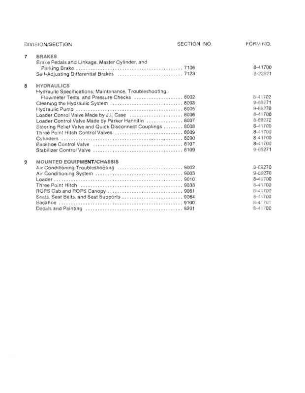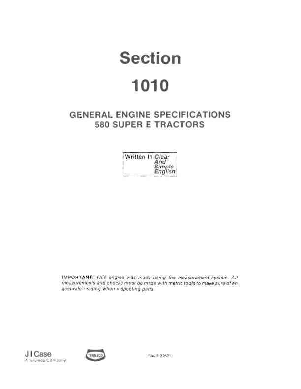 Case 580E & 580 Super E Backhoe Loader Service Manual [PDF], This document is a service manual. It contains sections covering the general operation of the tractors as well as sections for specific systems including the engine, clutch, gearbox, transmission, brakes, hydraulics, steering, axle, auxiliary equipment, electrical system, and cab. Each section provides information on removal and installation of components, overhaul procedures, specifications, diagrams, and troubleshooting.