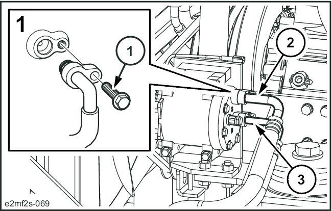 Use a hexagon wrench [ 8 ] remove the 4 hexagon bolts (1) and 2 split flanges (2) , and then remove the hydraulic hose (3) FF472B07