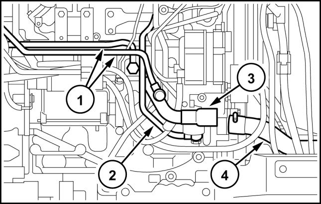 23. Detach the steering system pipes (1) and (2) the pipe delivering oil to the spool valve (3) Remove the fixings of the bracket (4) from the engine