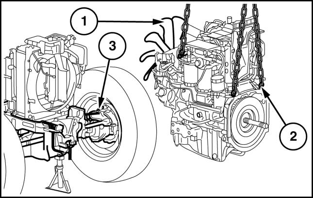 45. Check that there are no brackets between the engine and the cooling assembly, detach the engine (2) from the front axle, (3) trying to avoid incorrect movements with the hoist in order not to damage the radiator fins (1) with the engine fan. Rest the engine (2) on a support.