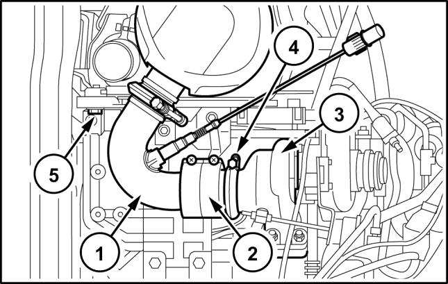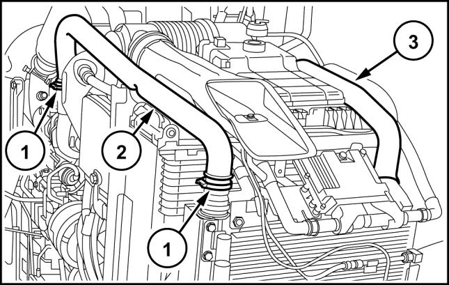18. Loosen the fixing clamps (1) and extract the pipe from the turbine to the radiator intercooler (2) Carry out the same operation for the pipe from the radiator intercooler to the engine (3)