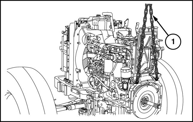 38. Position the movable tractor stand 380000569 (2) (1) with the bracket and adapter plate under the engine and place a wooden block in between the points of contact between the stand and engine. Wedge the axle to prevent swinging.