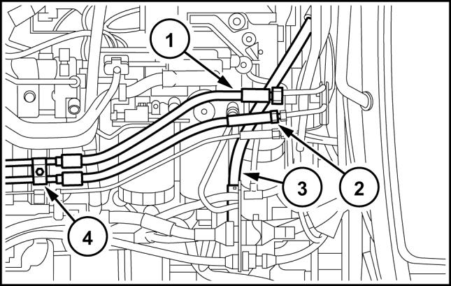 28. Detach the pipes of the cooler (1), differential lock (3) and, if applicable, front braking assembly (4)