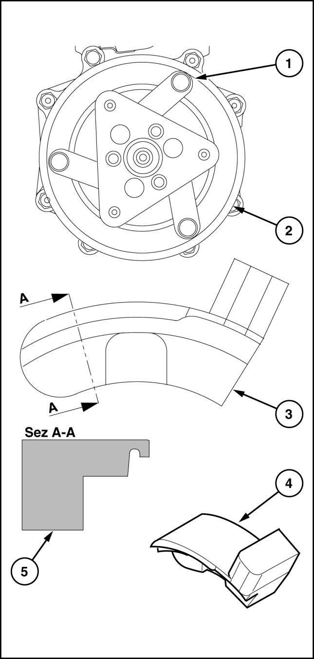 The top part (1) and the right-hand part (2) should be removed as a block, when possible, by removing the fixing screws (3) to the right of the engine (these screws work on a vertical slot that allows the support (2) to take on various positions in height). Before disassembly, take some references on the position of the unit on the engine, so that during reassembly it is possible to restore it to the exact position in which it was first found.