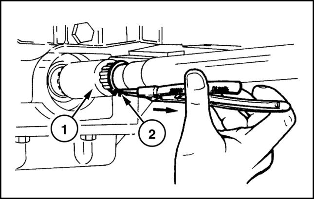 12. Remove the circlip (2) and move the front sleeve (1) in the direction indicated by the arrow until it is released from the groove on the front axle.