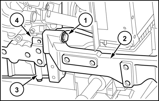 44. Remove the bolts (1) fastening the front axle support (2) to the engine. Remove the adjuster spacers for the support - monobloc (4) / sump (3)
