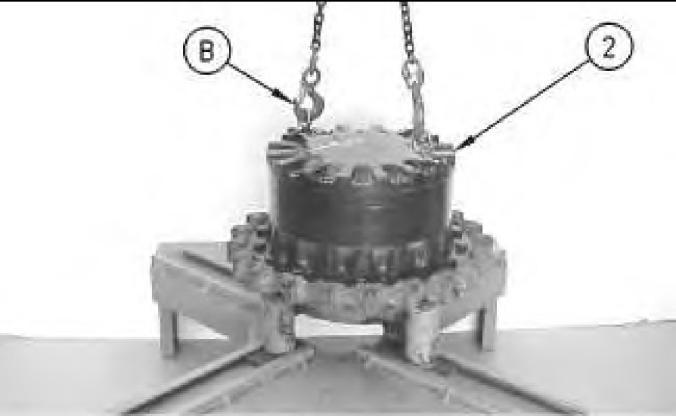4. Removethesetscrewsfromcover(2),andfastenTooling(B)andasuitableliftingdevi ceto cover(2),asshown.Theweightofcover(2)isapproximately32kg(70lb).Removeco ver (2).