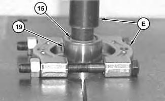16. Rotate shaft (15). Use a suitable press and Tooling (E) to remove bearing race (19) from shaft (15).