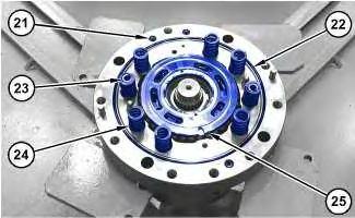 13. Remove O-ring seals (21), O-ring seal (22), springs (23), springs (24), and port plate (25).