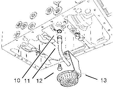 b. Remove bolts (12) and oil strainer (13) from the cylinder block. Inspect the oil strainer for damage. If the oil strainer is damaged, use a new part for replacement.