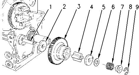 1. Remove retaining ring (9) that retains idler gear (3) on idler hub (1)