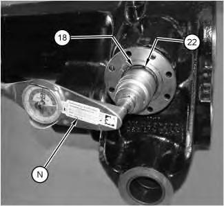17. Use Tooling (N) to check the rolling torque at the pinion. Rolling torque should be 1 to 3 N·m (9 to 26 lb in). If the rolling torque is not correct change spacer ring (24).