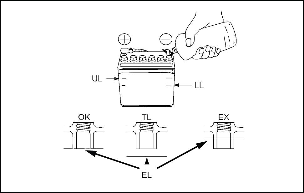 • Check the electrolyte level (EL) in the battery. When the amount of fluid nears the lower limit (LL), fill with battery fluid (available in the market) to the upper limit (UL) If operation continues with insufficient battery fluid, the battery life is shortened, and the battery may overheat and explode.