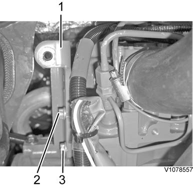 40. Remove upper fixing bolt (2) for left transport bracket (1) on engine, release lower fixing bolt (3) and swivel the bracket forwards.