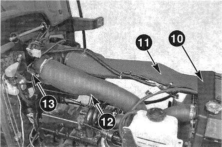 Remove the retaining bolts and remove the foam insulation bracket (10). Remove tie straps securing the upper engine harness to the air intake tube (11). Loosen the clamps and remove the air filter intake tube (11) and outlet tube (12). Disconnect the air filter restriction switch (13) from the harness. Cap the turbocharger inlet and outlet ports.