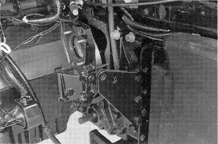Disconnect fuel auto advance temperature switch connector (54) and chassis ground connector (55). Remove the RH lower hood bracket retaining bolt and chassis ground cable (56). Remove the remaining retaining bolts and hood bracket (57).