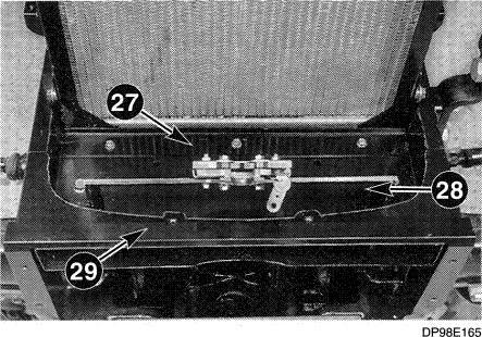 LDosan radiator seal bracket (27) retaining bolts. Remove the retaining bolts and remove the hood latch bracket (28) and top plate (29).