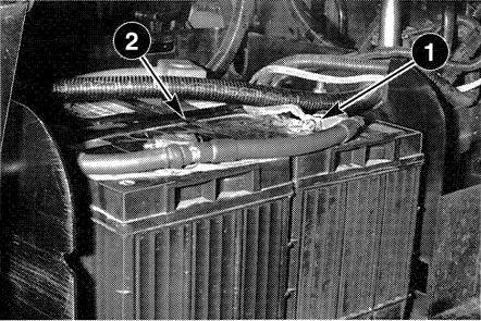 Disconnect and cap the steering hoses. Remove negative (-) terminals first. Disconnect engine the retaining bolts and carefully remove the front harness clean ground wire (1), remove the battery axle. clamp retaining nuts and clamp (2) and remove the batteries.