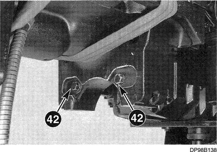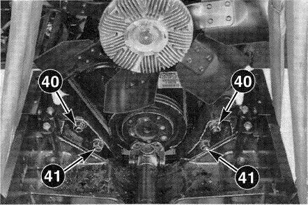 Attach suitable lifting equipment to the front bolster. Remove retaining nuts (40), (41), bolts (42) and washers. Remove the shims (if equipped) from between the bolster and engine sump. Carefully remove the front bolster.