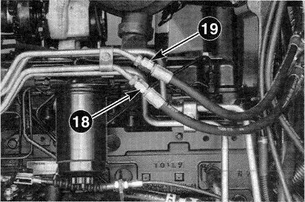 Remove the retaining bolts and remove air filter Put identification marks on and disconnect the bracket assembly (14). steering hoses (18) and (19). Cap the hoses and fittings.