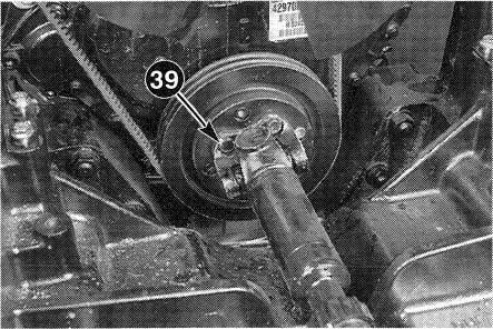 Remove retaining bolts and disconnect front PTO drive shaft (39) from the engine.