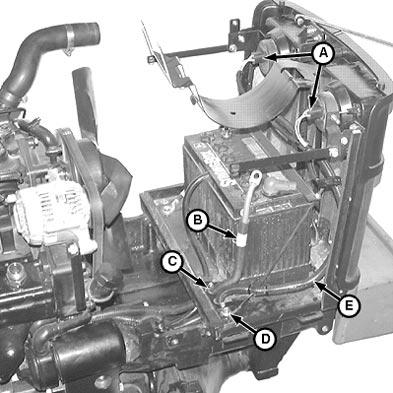 19.Pullcable(B)andwiringharness(E)intoenginebay compartment.