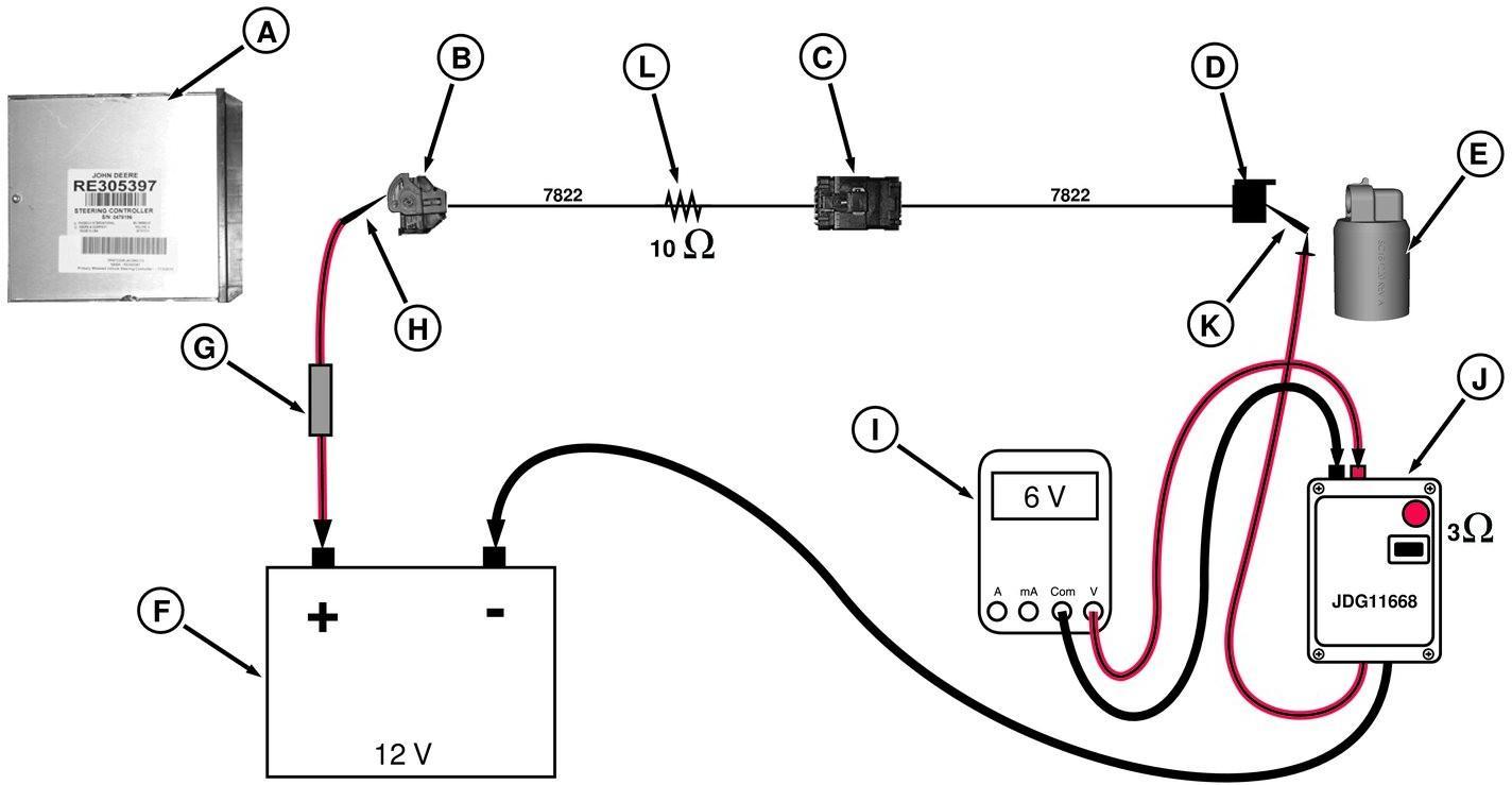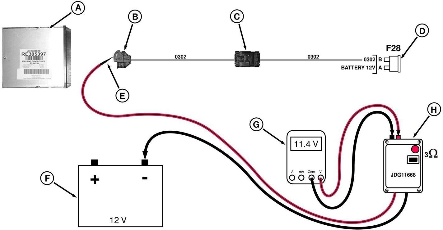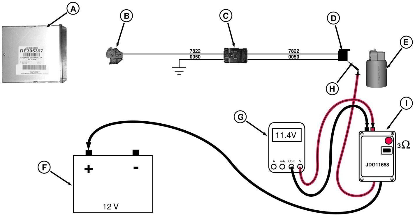 6. Press button on JDG11668 to apply load. Note and record voltage at multimeter (E) while the button is pressed.
