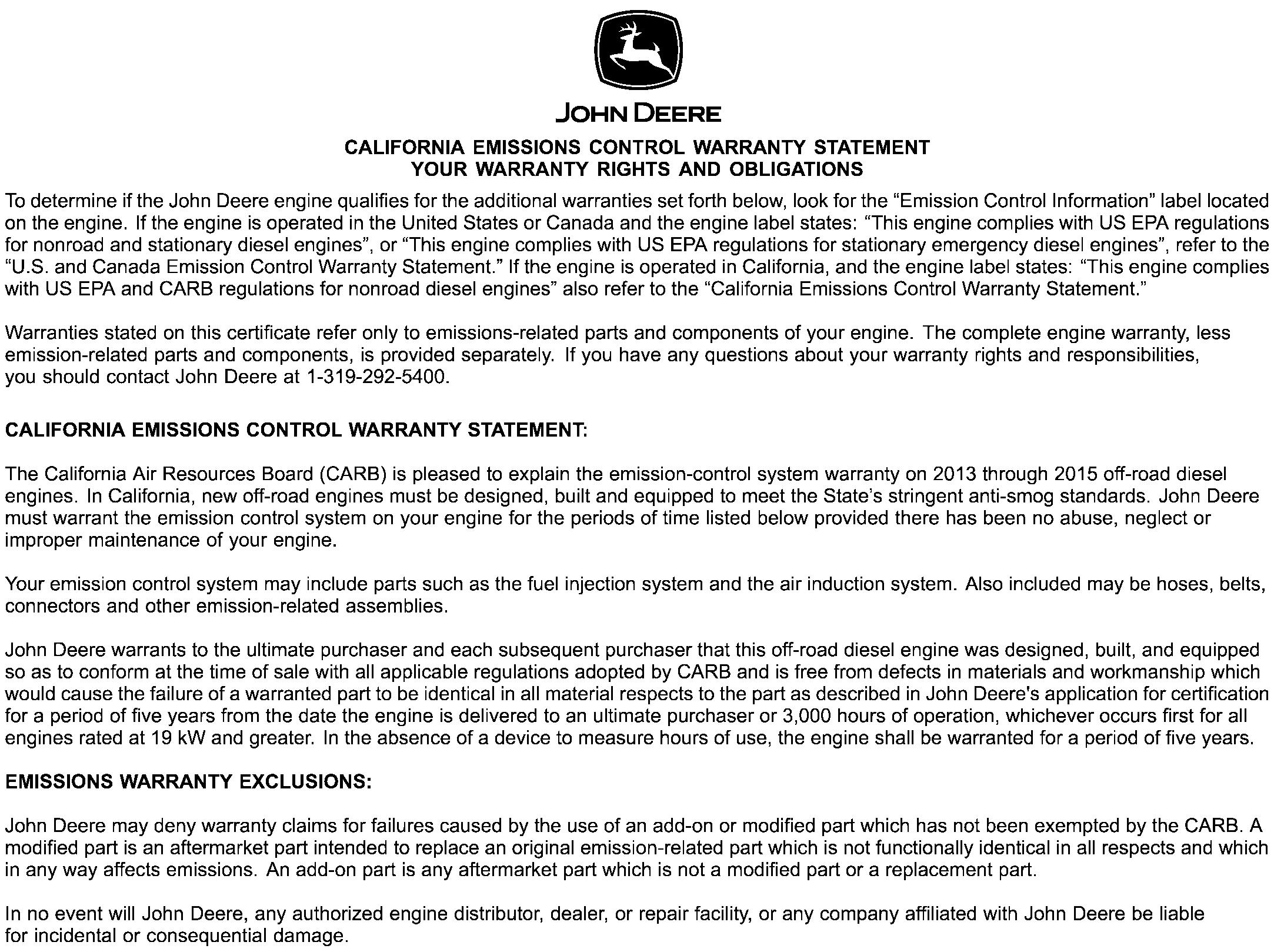 TodetermineiftheJohnDeereenginequalifiesfortheadditionalwarrantiessetforthbelow,lookforthe"EmissionsControlInformation"label locatedontheengine.IftheengineisoperatedintheUnitedStatesorCanadaandtheEmissionsControlinformationlabelstates:"Thisengine complieswithUSEPAregulationsfornonroadandstationarydieselengines”,or“ThisengineconformstoUSEPAnonroadcompression-ignition regulations”,refertothe"U.S.andCanadaEmissionControlWarrantyStatement."IftheengineisoperatedinCalifornia,andthelabelstates:"This enginecomplieswithUSEPAandCARBregulationsfornonroaddieselengines”,or“ThisengineconformstoUSEPAandCalifornianonroad compression-ignitionemissionregulations”,alsorefertothe"CaliforniaEmissionControlWarrantyStatement.”