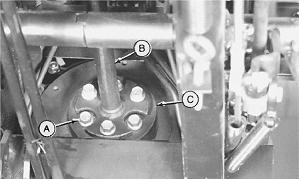 5. (Early Models) Rotate fixture 180°. Remove cap screw (A), and washer (B) to remove output shaft drive gear (C) (19 teeth).
